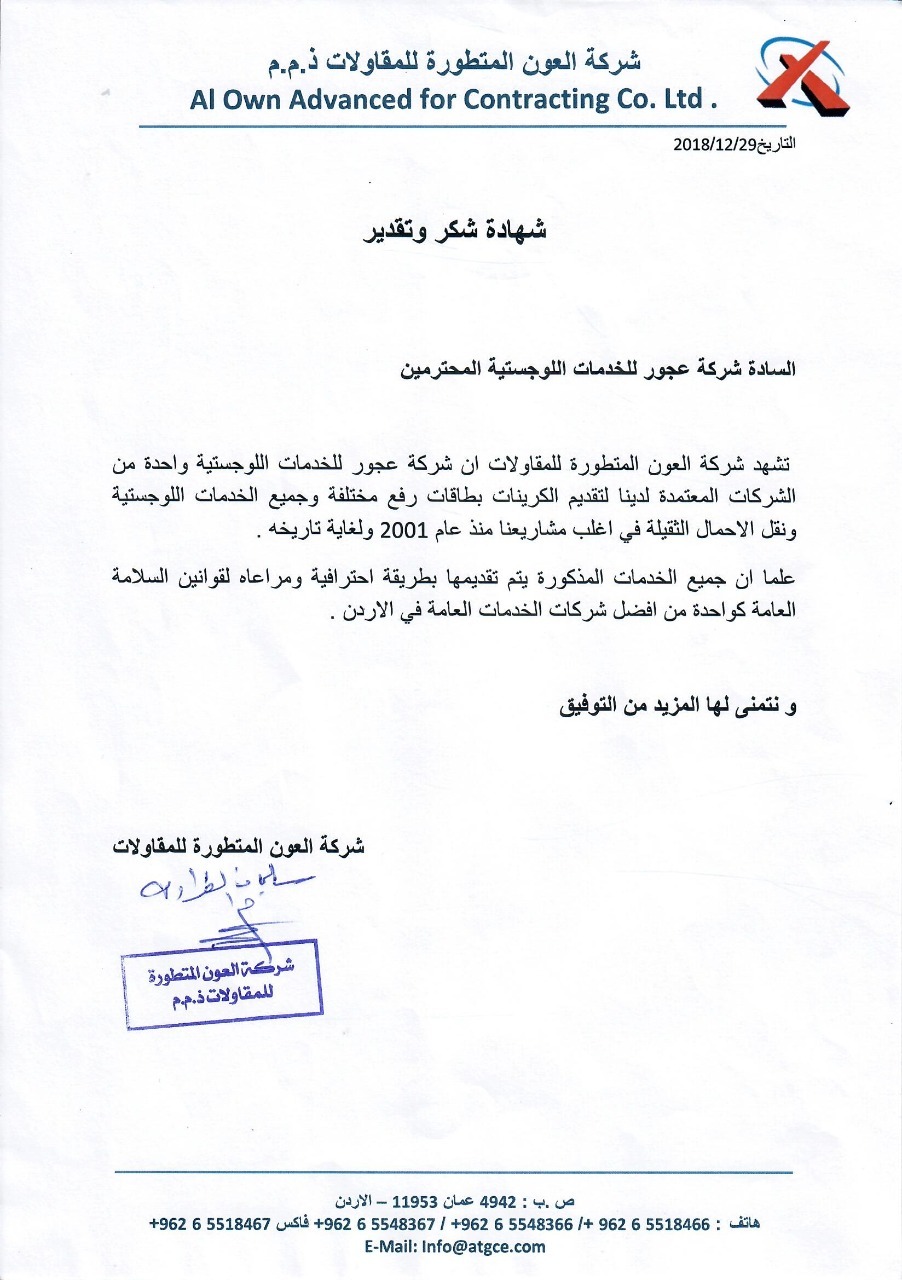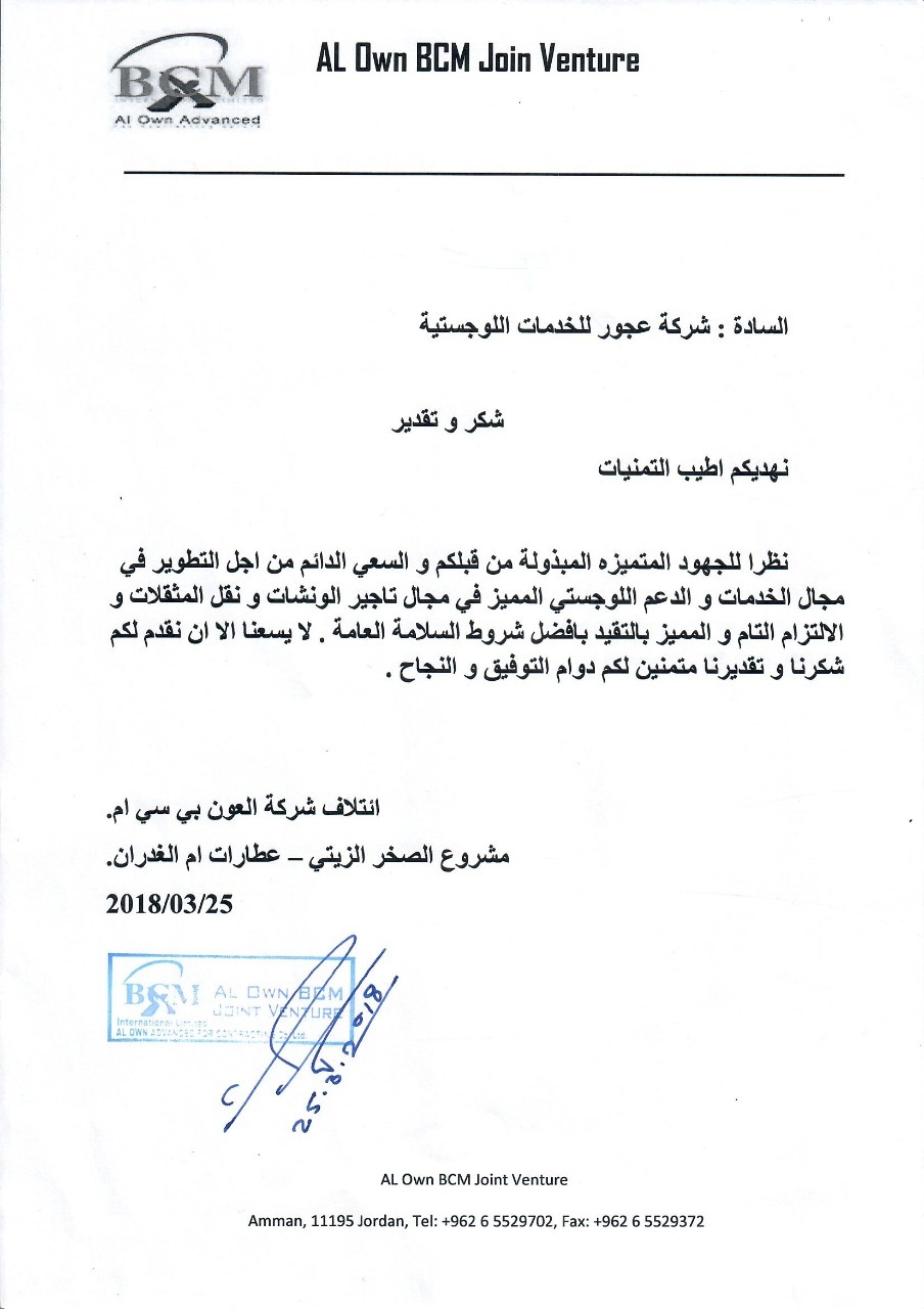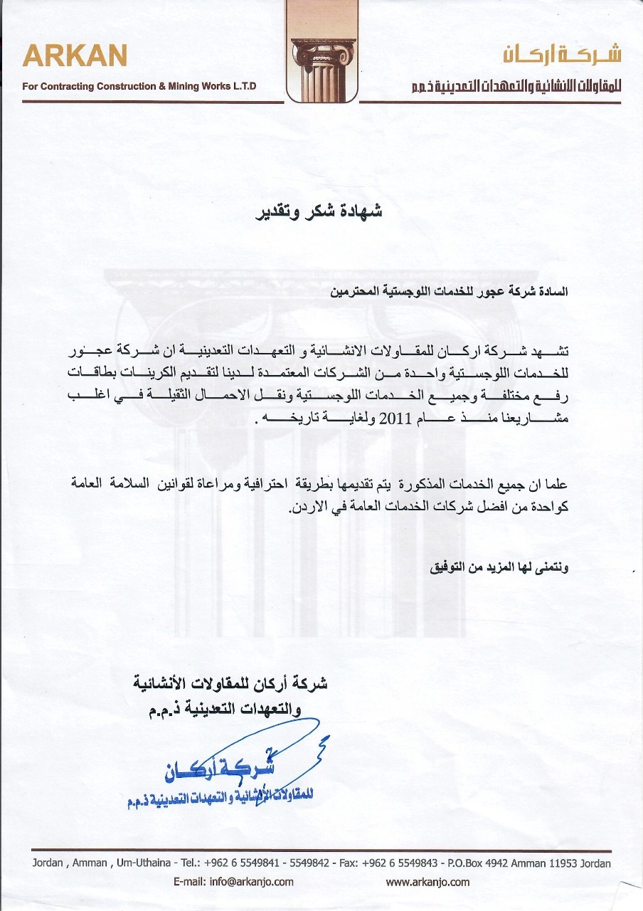 Founded by Imad Al-Ajouri, Al-Ajouri booths and lugs for transport operations and winches were established in 1984, then the Ajour Foundation was established in 2001. And soon he encouraged the use of forklifts, telescopic and people carriers (Man Lift) within that institution, then the Ajour Company for Logistics Services was established, and the growth of the Ajour Company for Logistics Services began and the purchase of more modern machines based in Abu Alanda - Al-Rajeeb Roundabout - near the Mercedes company.