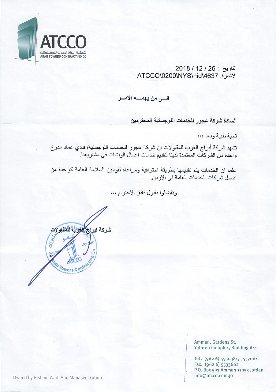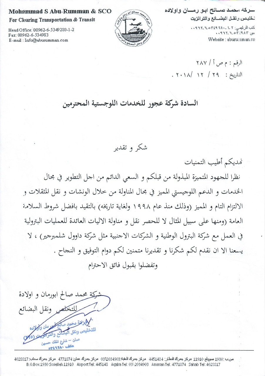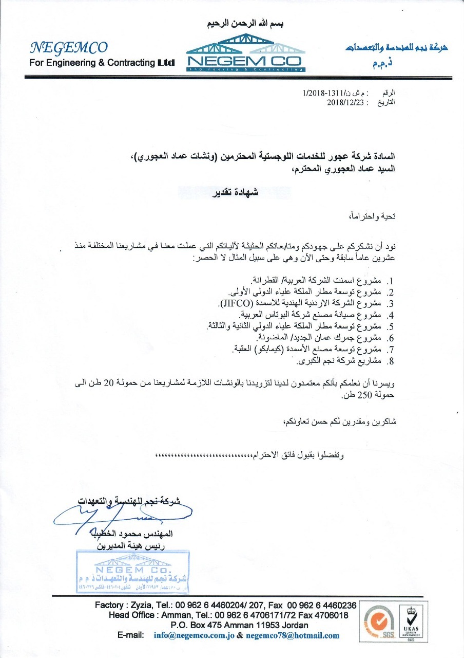 Founded by Imad Al-Ajouri, Al-Ajouri booths and lugs for transport operations and winches were established in 1984, then the Ajour Foundation was established in 2001. And soon he encouraged the use of forklifts, telescopic and people carriers (Man Lift) within that institution, then the Ajour Company for Logistics Services was established, and the growth of the Ajour Company for Logistics Services began and the purchase of more modern machines based in Abu Alanda - Al-Rajeeb Roundabout - near the Mercedes company.